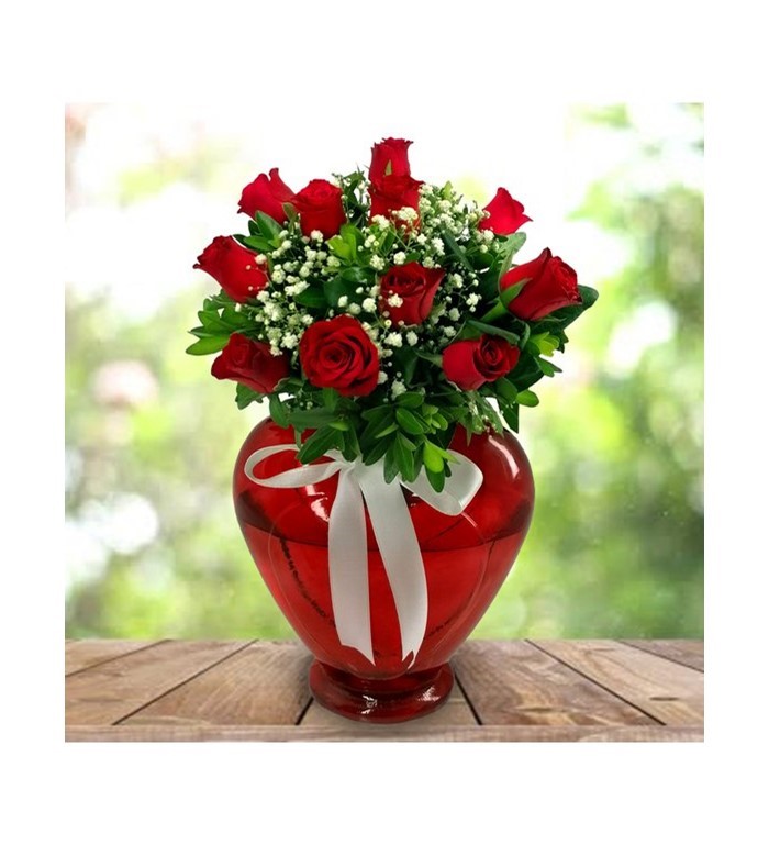 Yaklaşık 30 cm yükseliğinde kırmızı kalp şeklinde cam vazo içerisinde 11 adet kırmızı güller aranjmanı